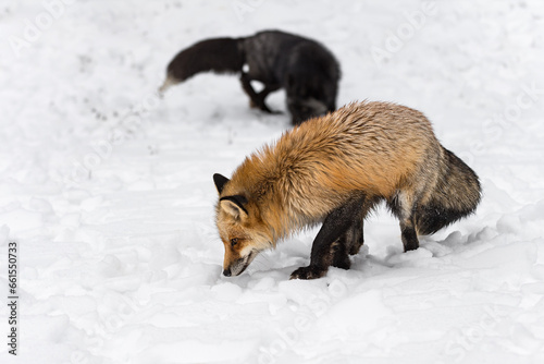 Naklejka premium Red Fox (Vulpes vulpes) Sniffs in Foreground Silver in Background Winter