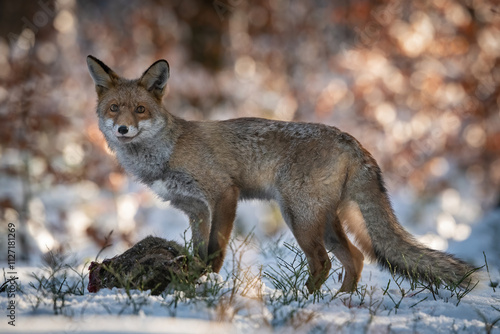 Obraz premium Red Fox (Vulpes vulpes) standing over its prey in a snowy forest, exuding...
