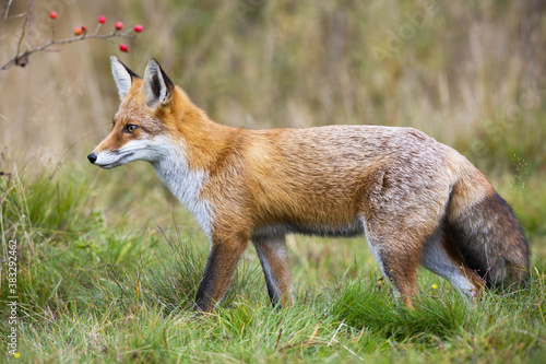 Fototapeta premium Red fox, vulpes vulpes, walking on green meadow in autumn nature. Wild...