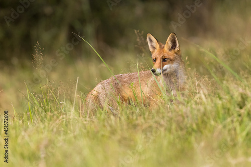 Fototapeta premium Red fox (vulpes vulpes), walking on green meadow in autumn nature. Wild...