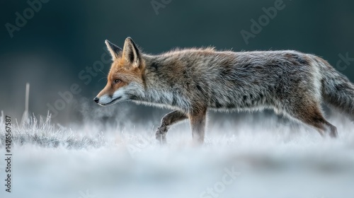 Naklejka premium Red fox walking frosty field, dawn, wildlife