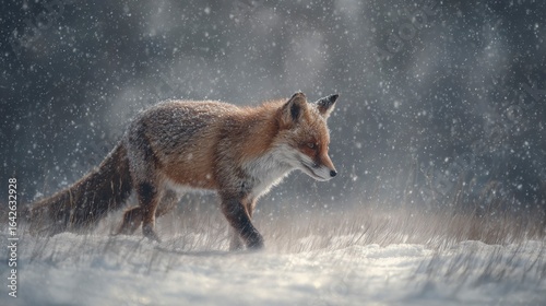 © Fandy creators, Obraz premium Red fox walking in snowy forest