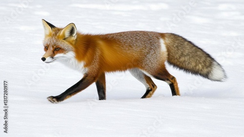 Fototapeta premium Red fox walking in snowy landscape, winter scene, wildlife photography, animal in snow, fluffy tail, winter fur, natural habitat