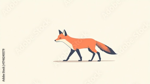 © Soonwiin, Obraz premium Red fox walking, minimalist style, pale background, animation, children's book