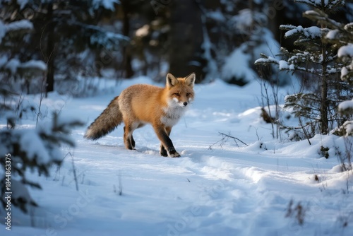 © zhang yongxin, Naklejka premium Red fox walking through a snowy forest in winter