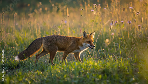 © siraphol, Obraz premium Red fox walking through wildflower meadow at golden hour with warm backlight