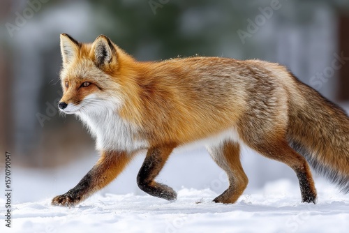 © YouraPechkin, Obraz premium Red fox walks gracefully across a snowy landscape in winter sunlight