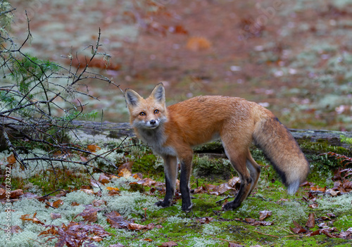 Obraz premium Red fox with a bushy tail walking in the forest in autumn in Algonquin Park, Canada