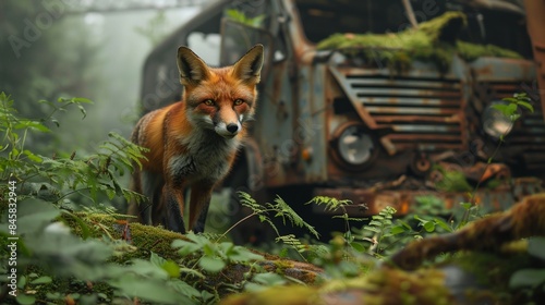 © Joyce, Naklejka premium Red fox with abandoned military base debris with green plants growing. Post apocalypse scene.
