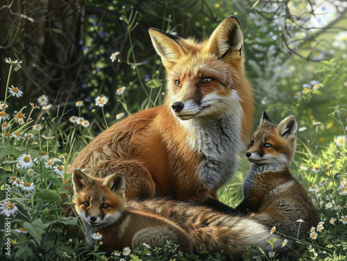 Fototapeta premium Red Fox with Adorable Pups in Forest