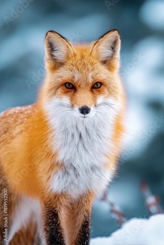 © Natalia, Obraz premium Red fox with bright orange fur stands gracefully in a snowy forest, showcasing its striking features against the serene winter landscape, perfect for wildlife enthusiasts