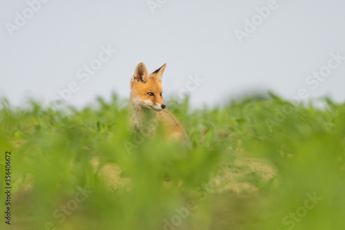 © djoronimo, Fototapeta premium Red fox youngster sitting in the field.