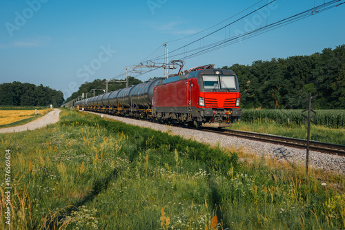 © Anze, Naklejka premium red freight train hauling cylindrical tank cars through a rural landscape. It s a sunny day with clear skies, green fields, wildflowers, and a nearby dirt path beside the tracks.