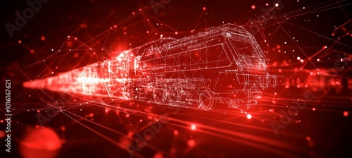 Fototapeta premium Red Futuristic Train Speeding Through Digital Network Data, AI Technology in Transportation