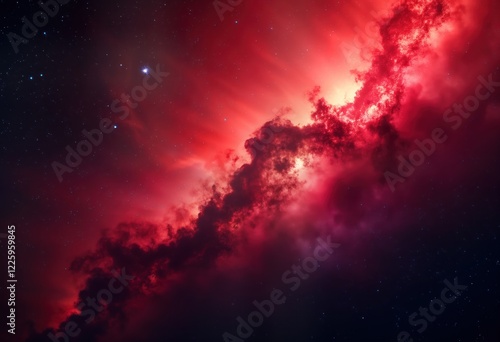 Naklejka premium Red galaxy night sky background with stars. Deep red cosmic clouds fill night sky. Stars shimmer in dark background. Red nebula. Abstract space art. Fantasy cosmic illustration. Digital artwork.