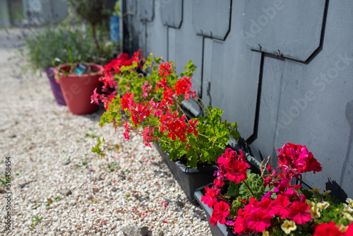 © Taras Garkusha, Naklejka premium Red garden geranium flowers in pot , close up shot geranium flowers, pelargonium