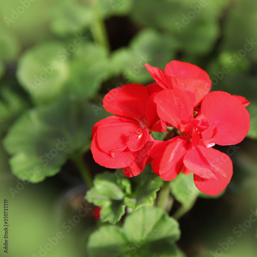 Obraz premium Red geranium flowers on a background of green leaves