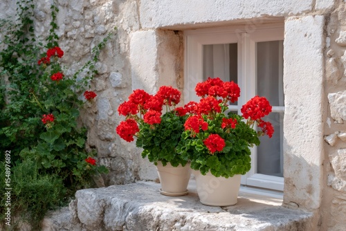 © kardaska, Naklejka premium Red geraniums growing in pots on window sill of stone house