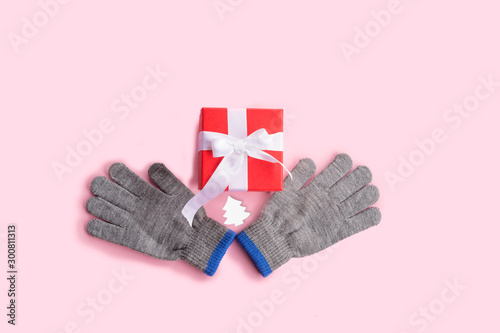 Obraz premium Red gift box, gloves and spruce figurine white on pink background