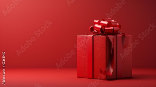 Fototapeta premium Red gift box with bow on matching red background