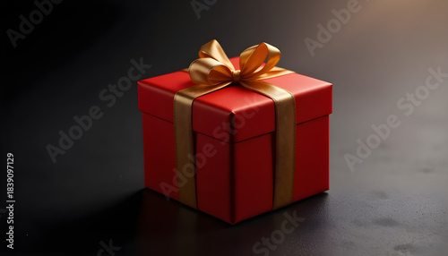 © Gulhayo, Fototapeta premium red gift box with gold ribbon, isolated on blackbackground, soft spotlight, luxury holiday mood