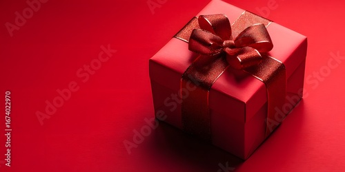 © Sohidul, Obraz premium Red Gift Box with Shiny Bow on Red Background