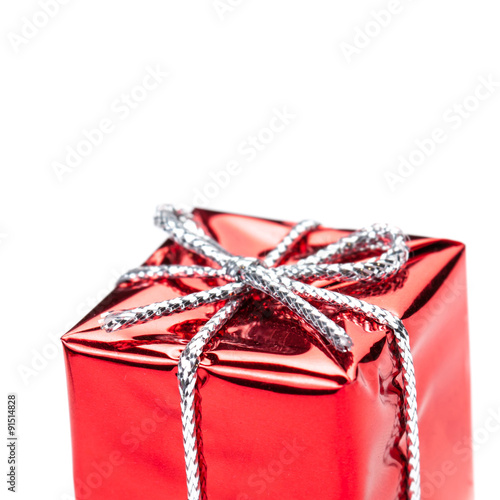Fototapeta premium Red gift box with silver ribbon and bow isolated on white macro