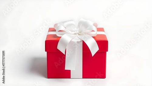 © Kura, Obraz premium Red gift box with white ribbon and bow, centered product shot on clean background.