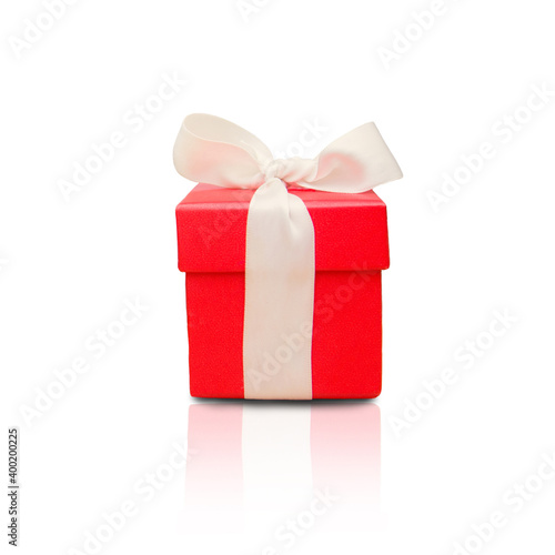 Obraz premium Red gift box with white ribbon isolated on white background. Copyspace