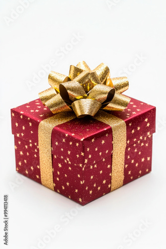 Obraz premium Red gift box wrapped with gold bow and ribbon isolated on white background