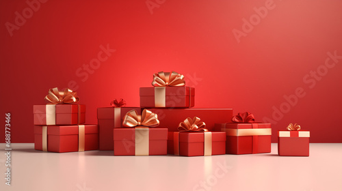Obraz premium Red gift boxes on a red background with golden ribbon.