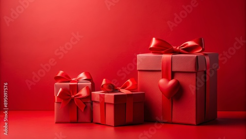 © Stock Spectrum, Obraz premium Red Gift Boxes with Heart on Red Background, Gift, Valentine's Day, Love, Romance