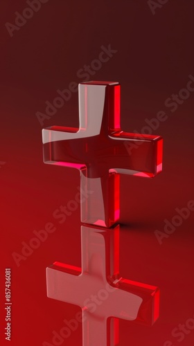 © iVGraphic, Obraz premium Red glass cross on a reflective red background, minimalistic design concept