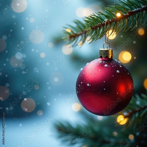 Fototapeta premium Red glass ornament on a branch with twinkling lights, winter wonderland,...