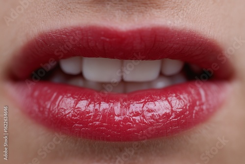 © avaye, Obraz premium Red glossy lips close-up view, Female mouth with lipstick detail, Beauty shot useful in makeup ads