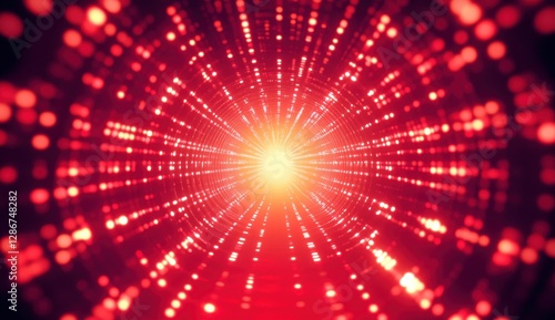 © Nasima, Naklejka premium Red glowing digital data background with light effect and binary code, technology wallpaper vector illustration of a tunnel made from red square lights
