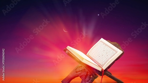 Obraz premium Red-Gold Holy islamic Quran Book in hand