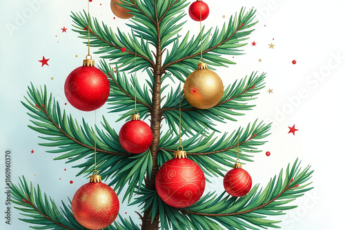 Fototapeta premium red gold ornaments adorn beautifully painted spruce tree festive christmas balls watercolor details surrounding