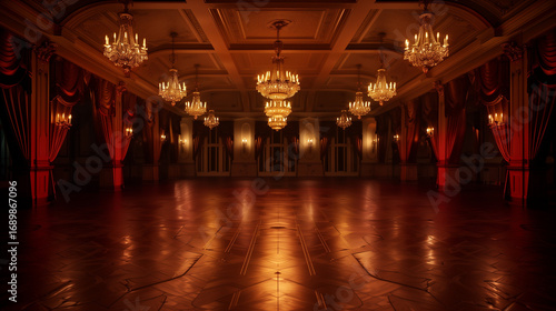 Fototapeta premium Red Gothic Ballroom with Chandelier Lights and Haunted Halloween Vibes