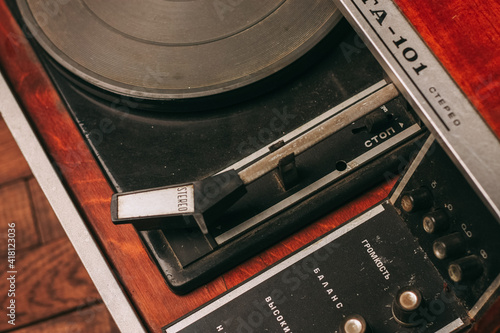 Fototapeta premium red gramophone record player vintage nostalgia wood background