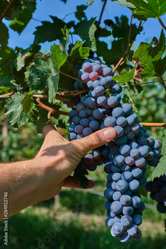 © Berg, Obraz premium Red grape variety, grape harvest, grape bunch in hand. Grapes in vineyard raw ready for harvest in Italy.