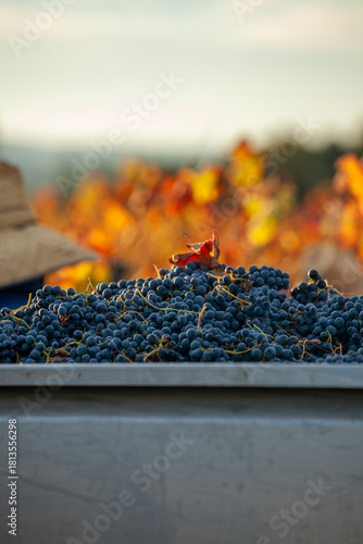 © Cavan, Naklejka premium Red grapes in grape bin after being hand harvested on a fall morning