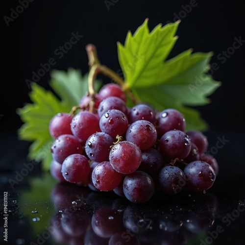 © miss irine, Fototapeta premium Red grapes with water drops sit on dark reflective surface. Green leaves are visible behind fruit bunch. Evening light creates moody atmosphere.