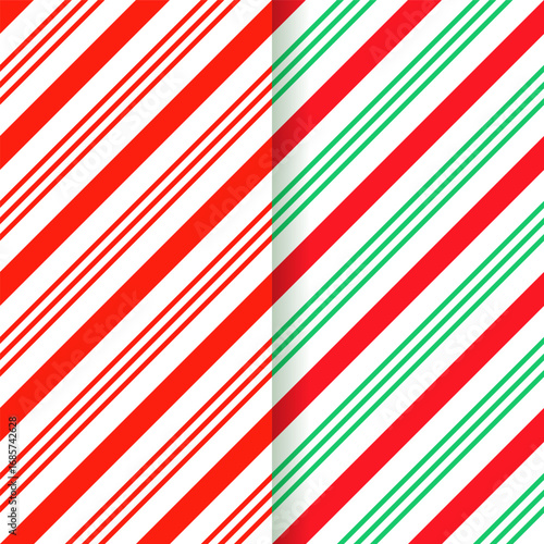 © Iryna, Naklejka premium Red green candy cane wrapping texture. Peppermint seamless pattern. Christmas striped background. Vector. Xmas holiday diagonal stripes. Set of cute caramel package prints. Geometric illustration.