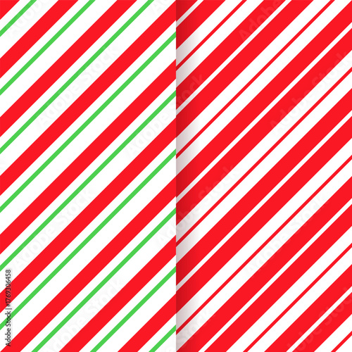 © Iryna, Naklejka premium Red green wrapping texture. Candy cane seamless background. Christmas striped pattern. Vector. Xmas holiday diagonal stripes. Set of cute caramel package prints. Geometric illustration.