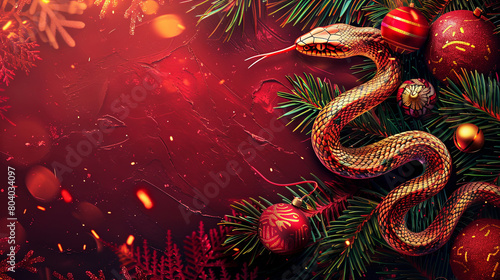 © Nastya, Obraz premium red greeting Happy New year card with Christmas tree and snake, copy space