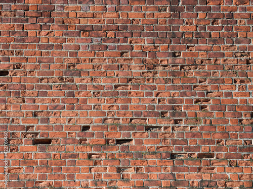Naklejka premium Red grunge brick wall, abstract background texture with old dirty and vintage...