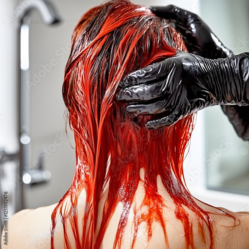 © imfotograf, Naklejka premium Red hair dye massage with gloved hands in salon