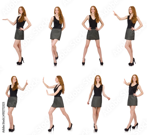 Fototapeta premium Red hair girl in gray dress isolated on white