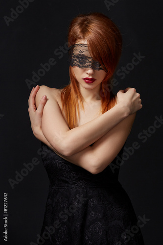 Fototapeta premium Red-haired beauty with lace mask on eyes